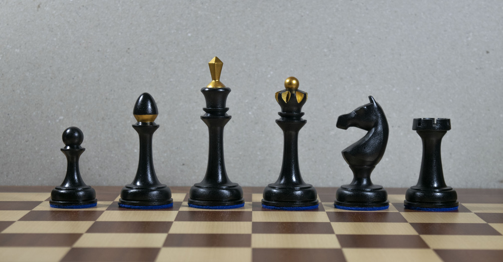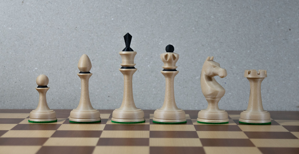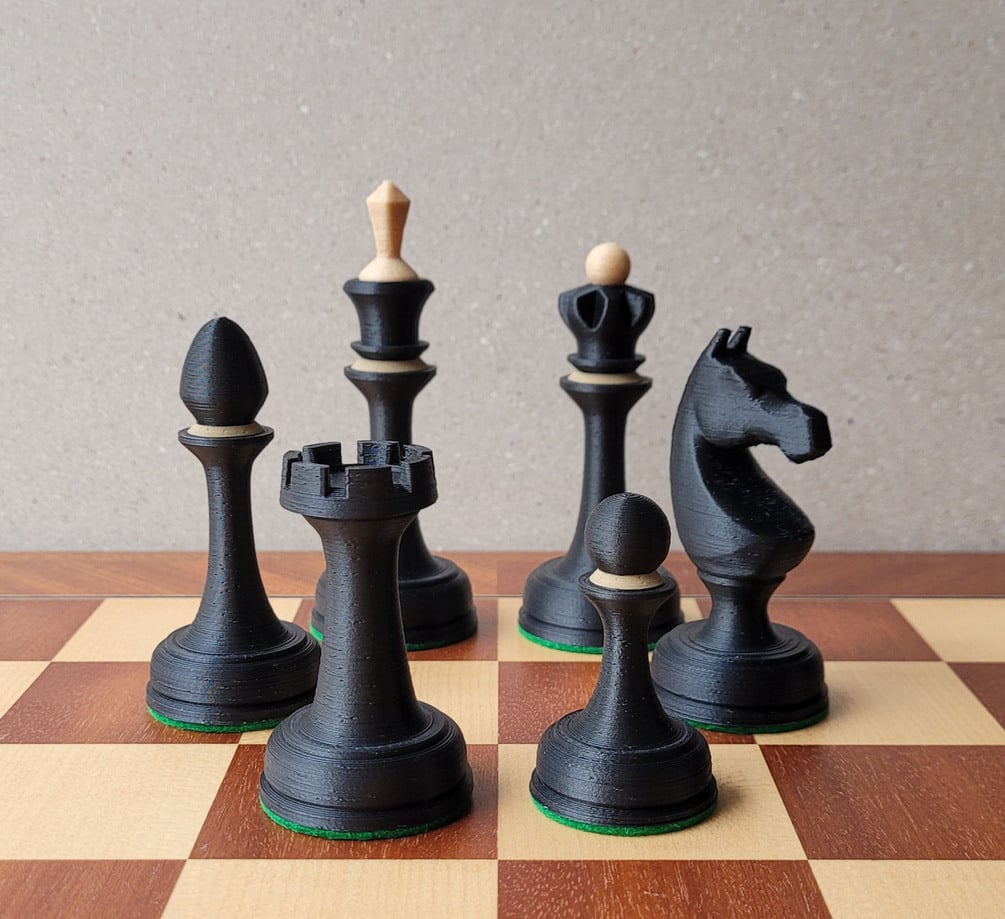 An original chess set, designed for 3D printing, inspired by Ukrainian early 20th century pieces. This elegant set features narrow stems and broad bases, an unusually slender rook and a highly distinctive, aggressive knight. The fluted collars reduce the need for printing supports, ensuring that the pieces print smoothly and cleanly.